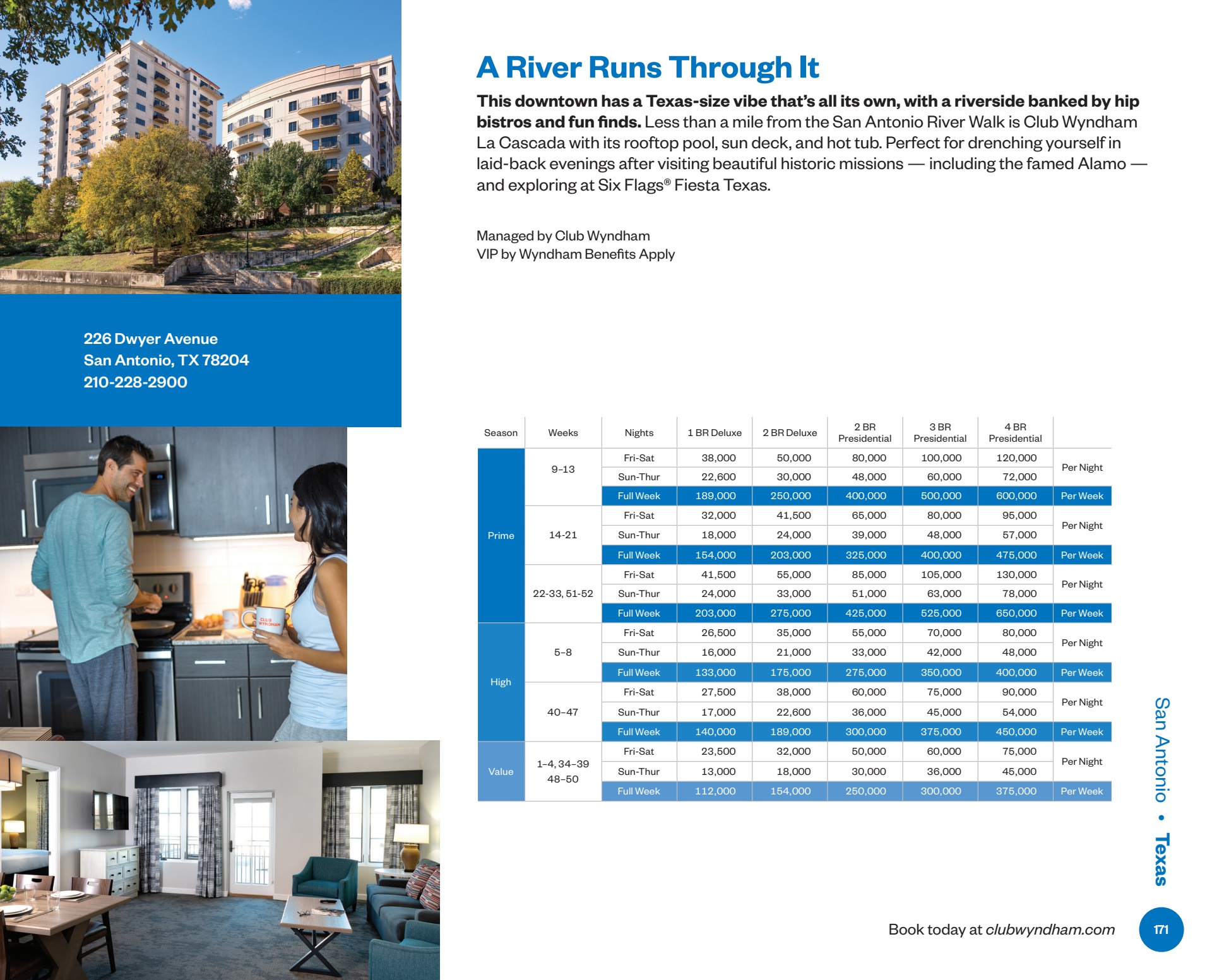 | PrimePeak demand weeks — highest points required22-33, 51-52 | Fri–Sat41,500Sun–Thu24,000Full week203,000 | Fri–Sat55,000Sun–Thu33,000Full week275,000 | Fri–Sat85,000Sun–Thu51,000Full week425,000 | Fri–Sat105,000Sun–Thu63,000Full week525,000 | Fri–Sat130,000Sun–Thu78,000Full week650,000 |
